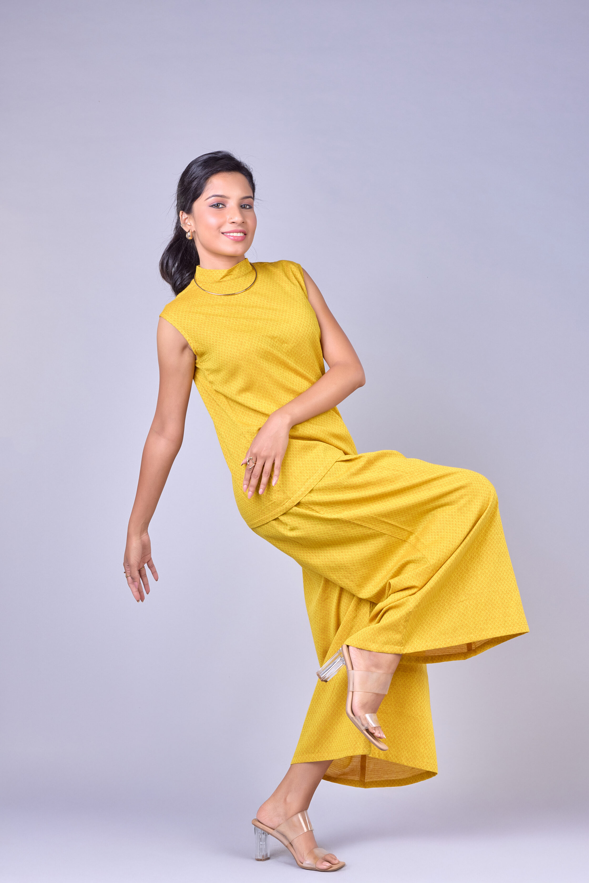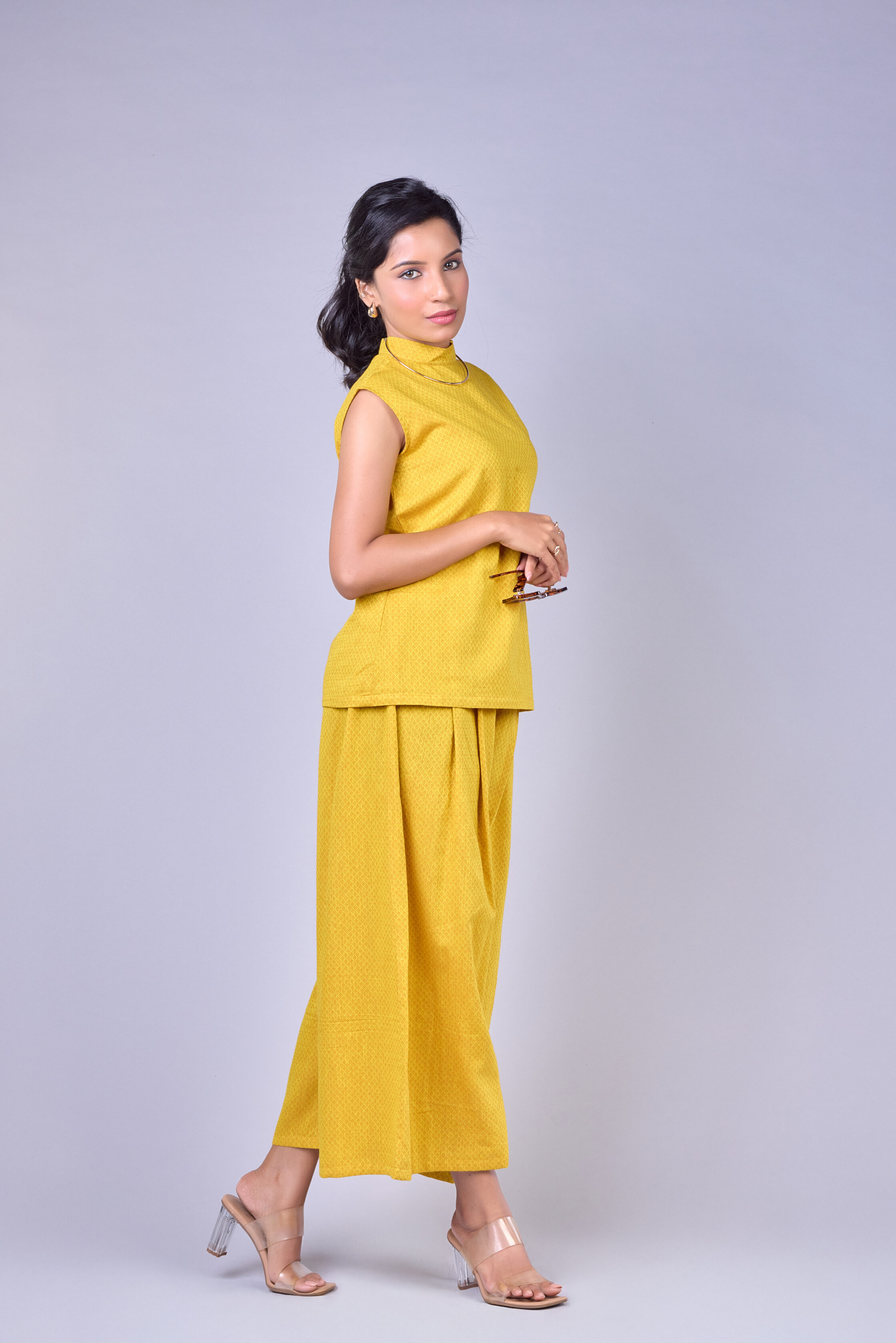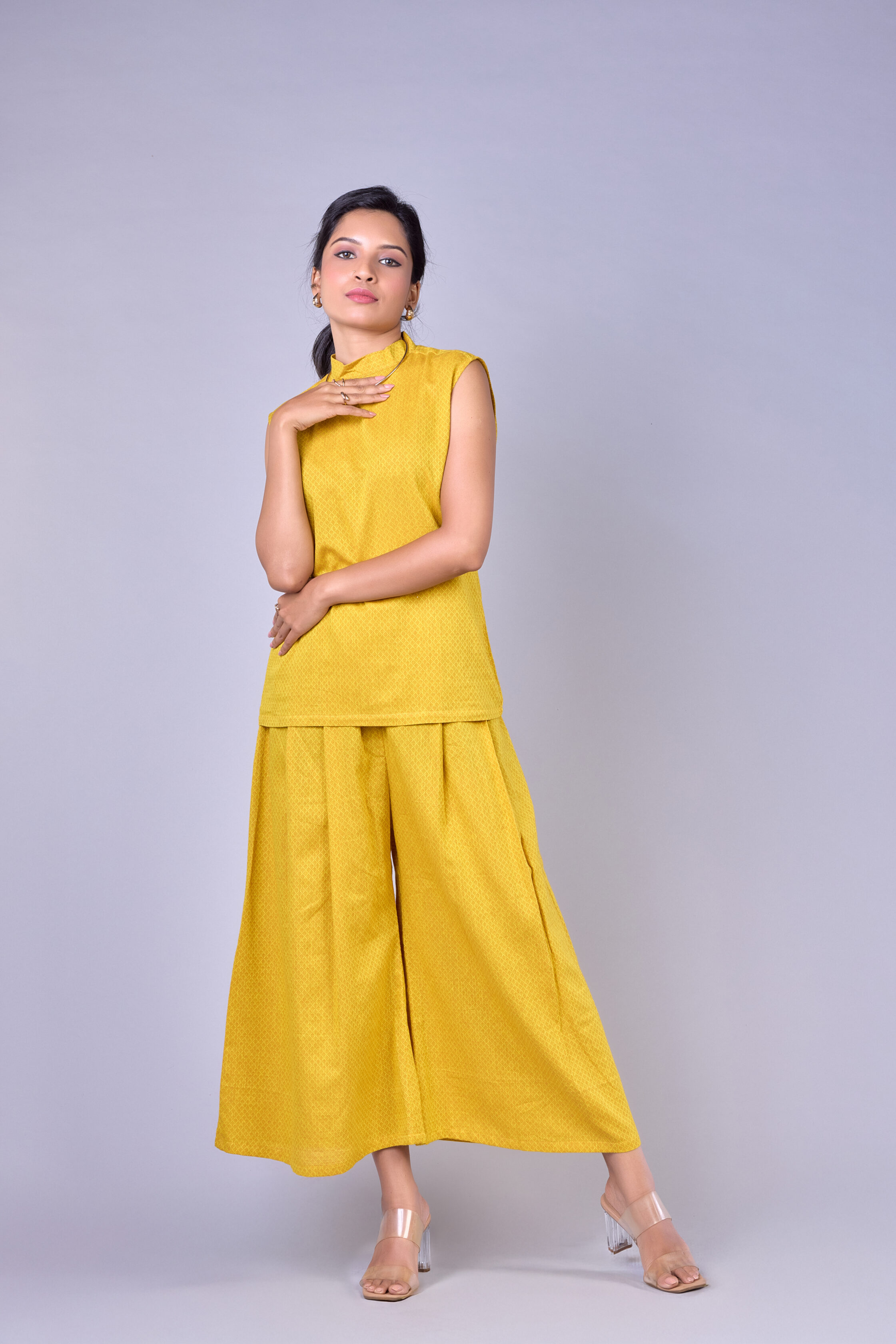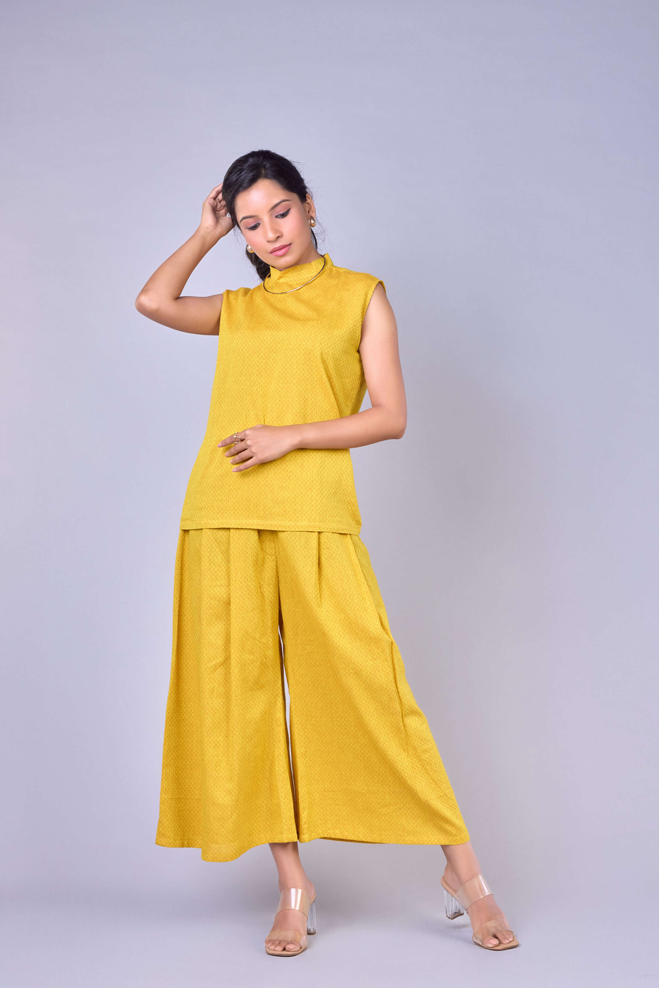 A vibrant yellow co-ord set featuring a sleeveless straight-fit top and matching wide-leg palazzo pants.