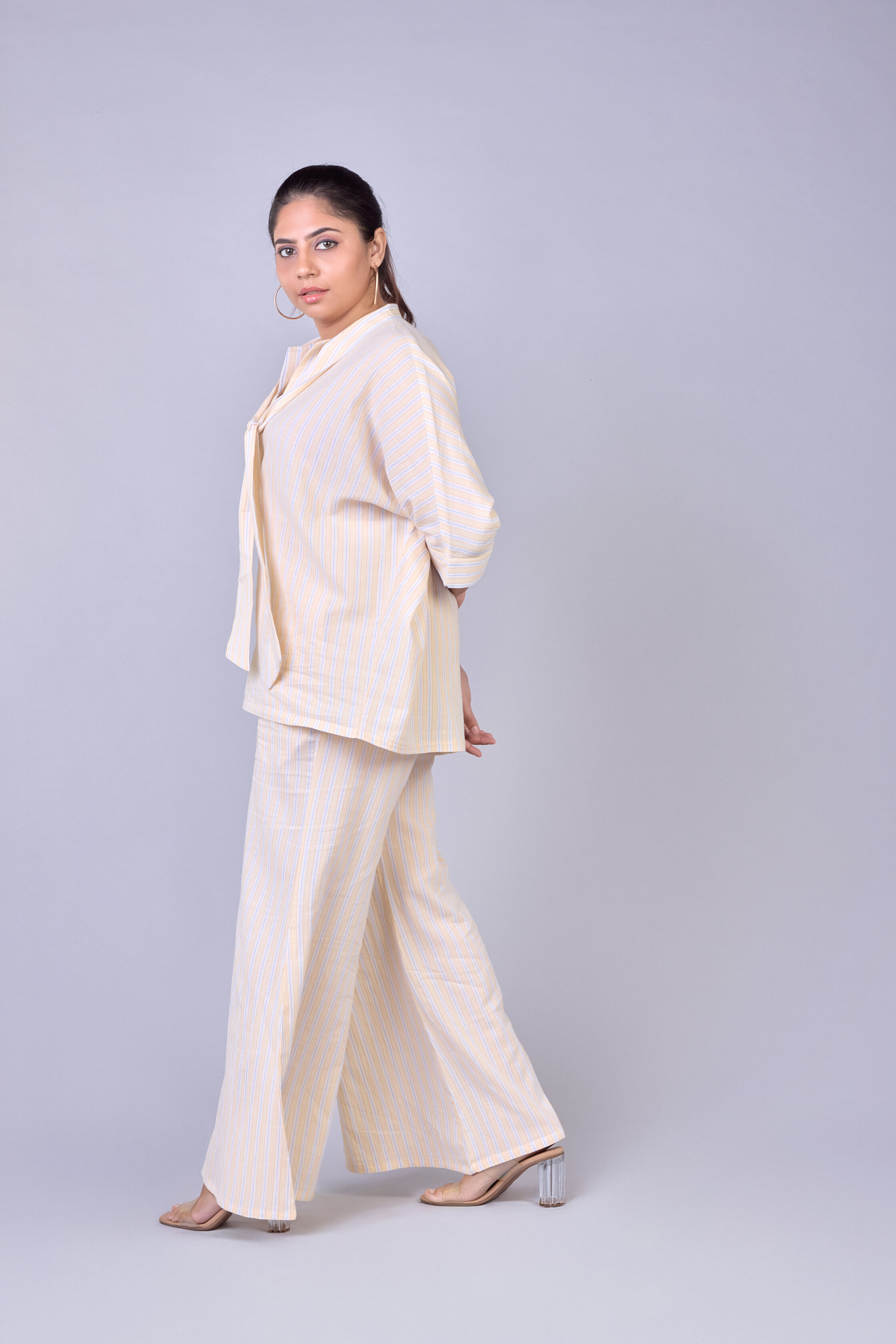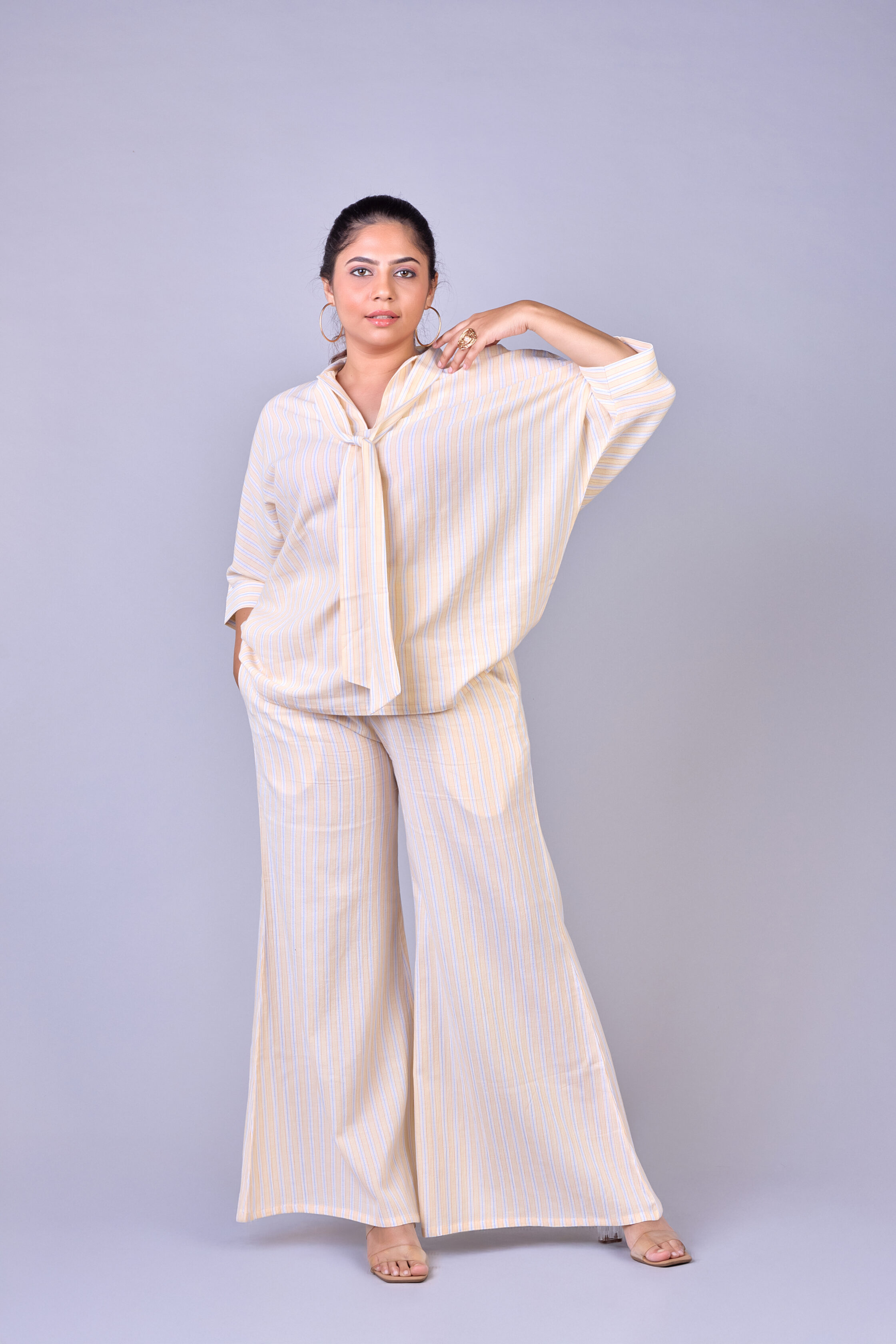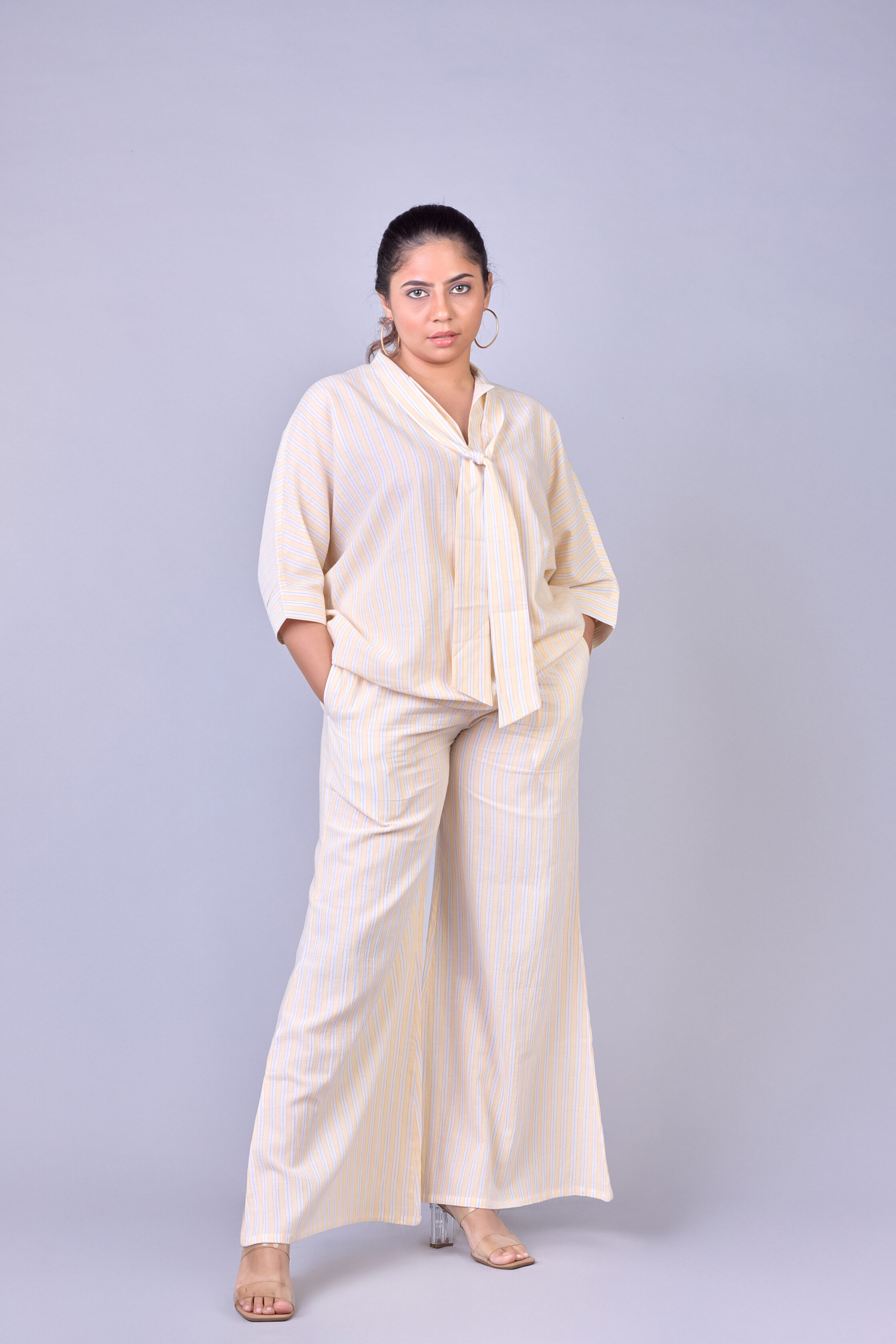 Effortlessly refined and designed for all-day comfort, this Beige Striped Co-Ord Set blends relaxed tailoring with understated elegance. Crafted from breathable, lightweight fabric, the set features a flowy tie-neck top paired with wide-leg pants for a flattering, elongated silhouette. The subtle vertical stripes enhance the overall structure while keeping the look soft and versatile — perfect for work, travel, or elevated everyday wear.