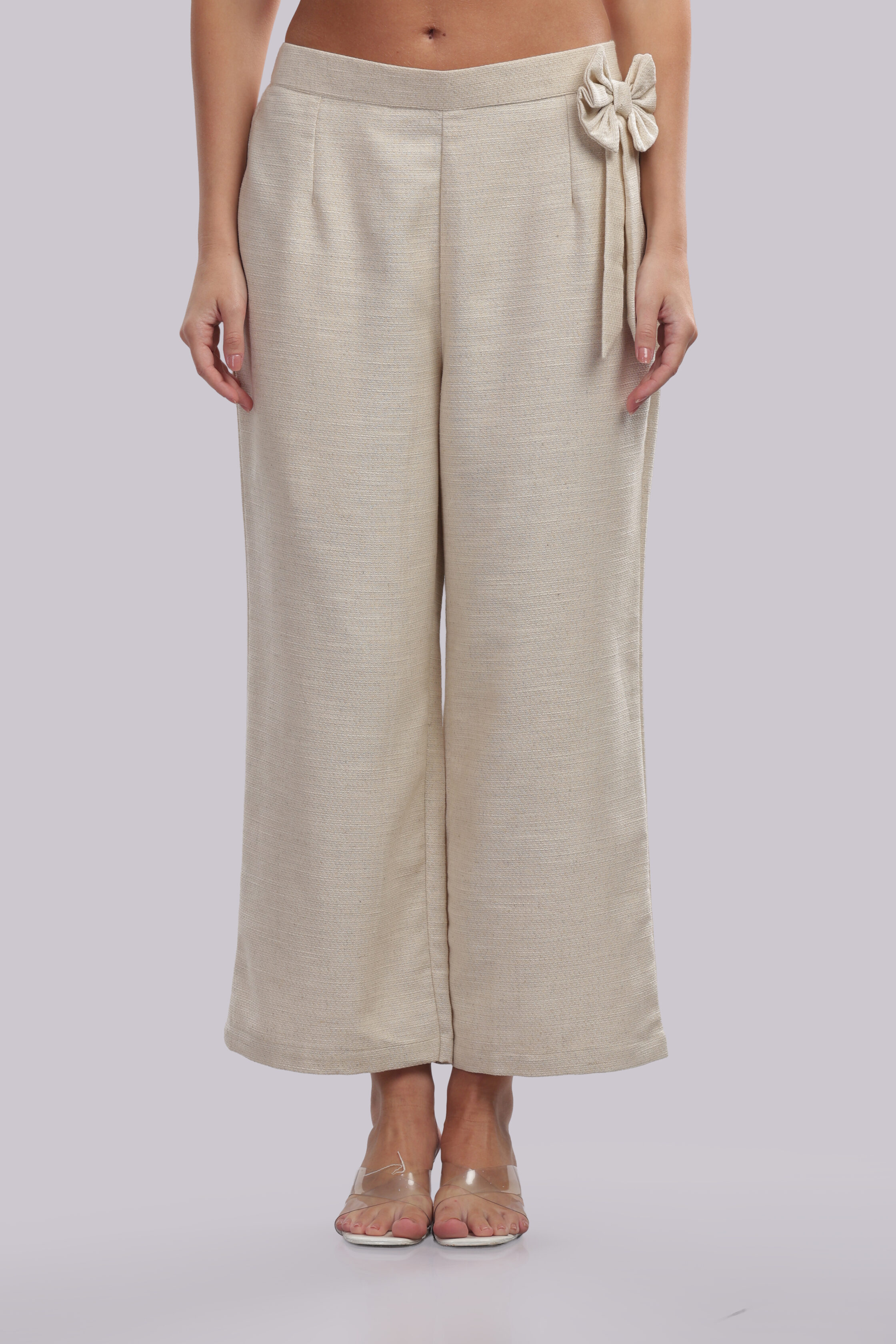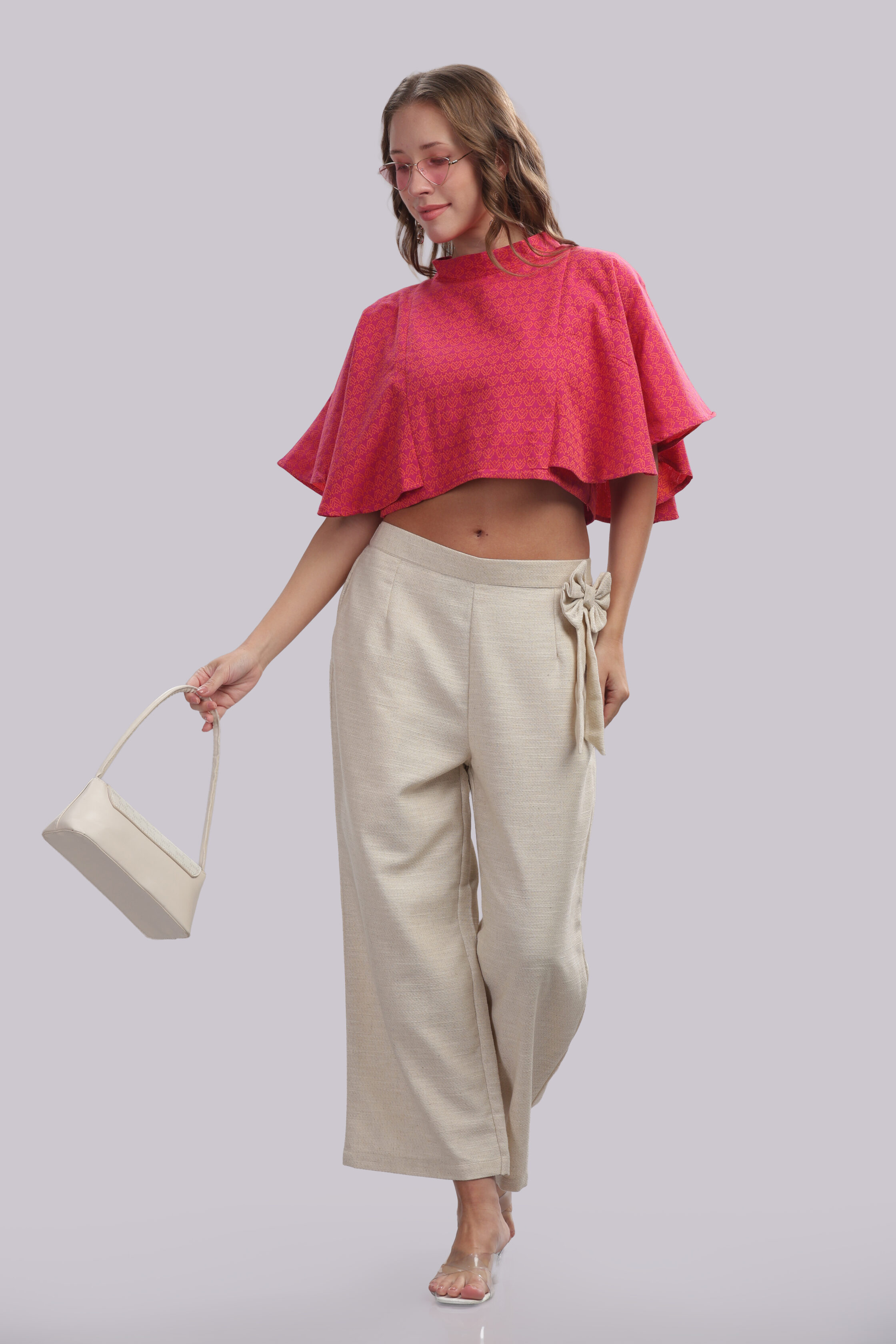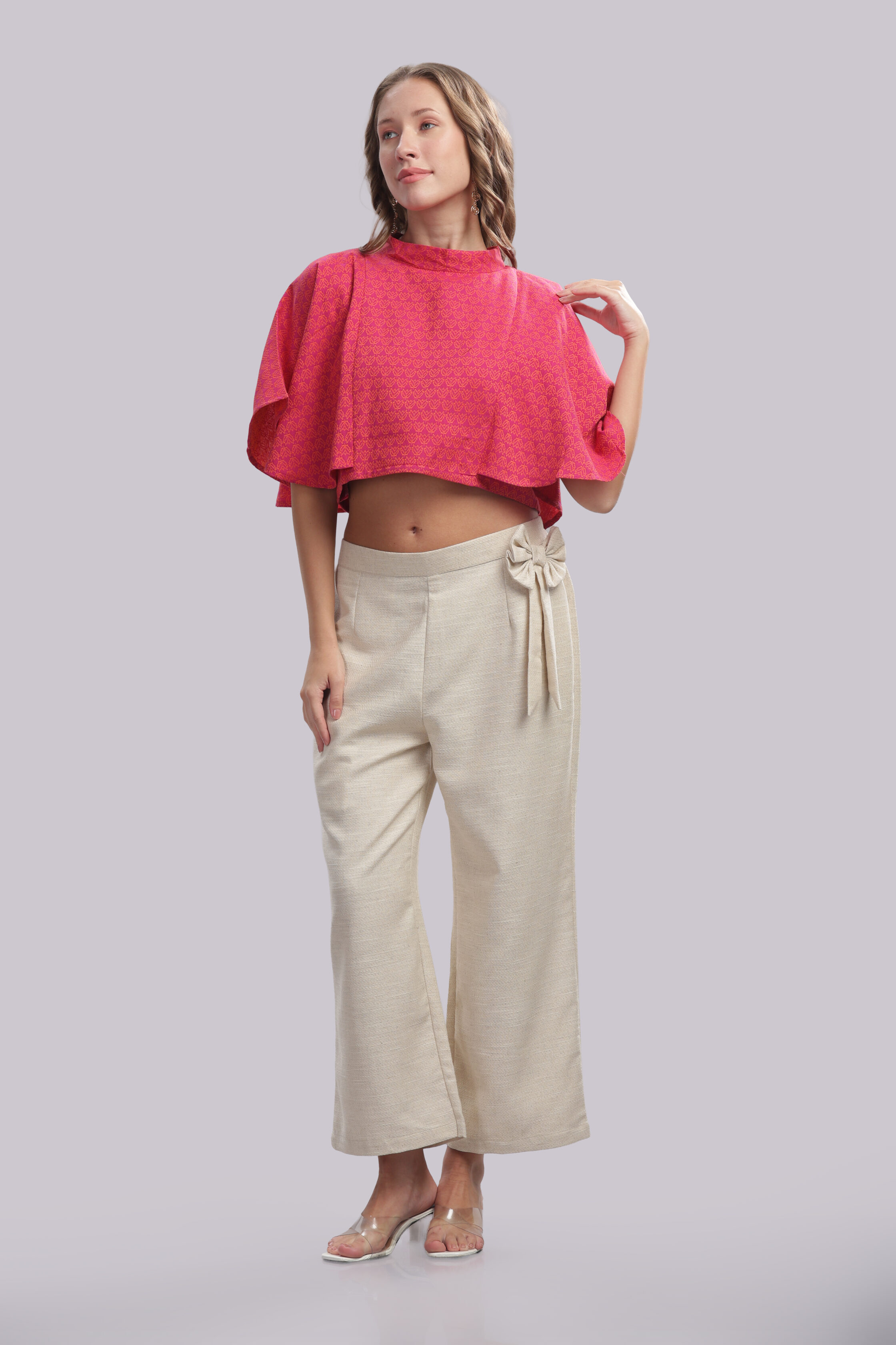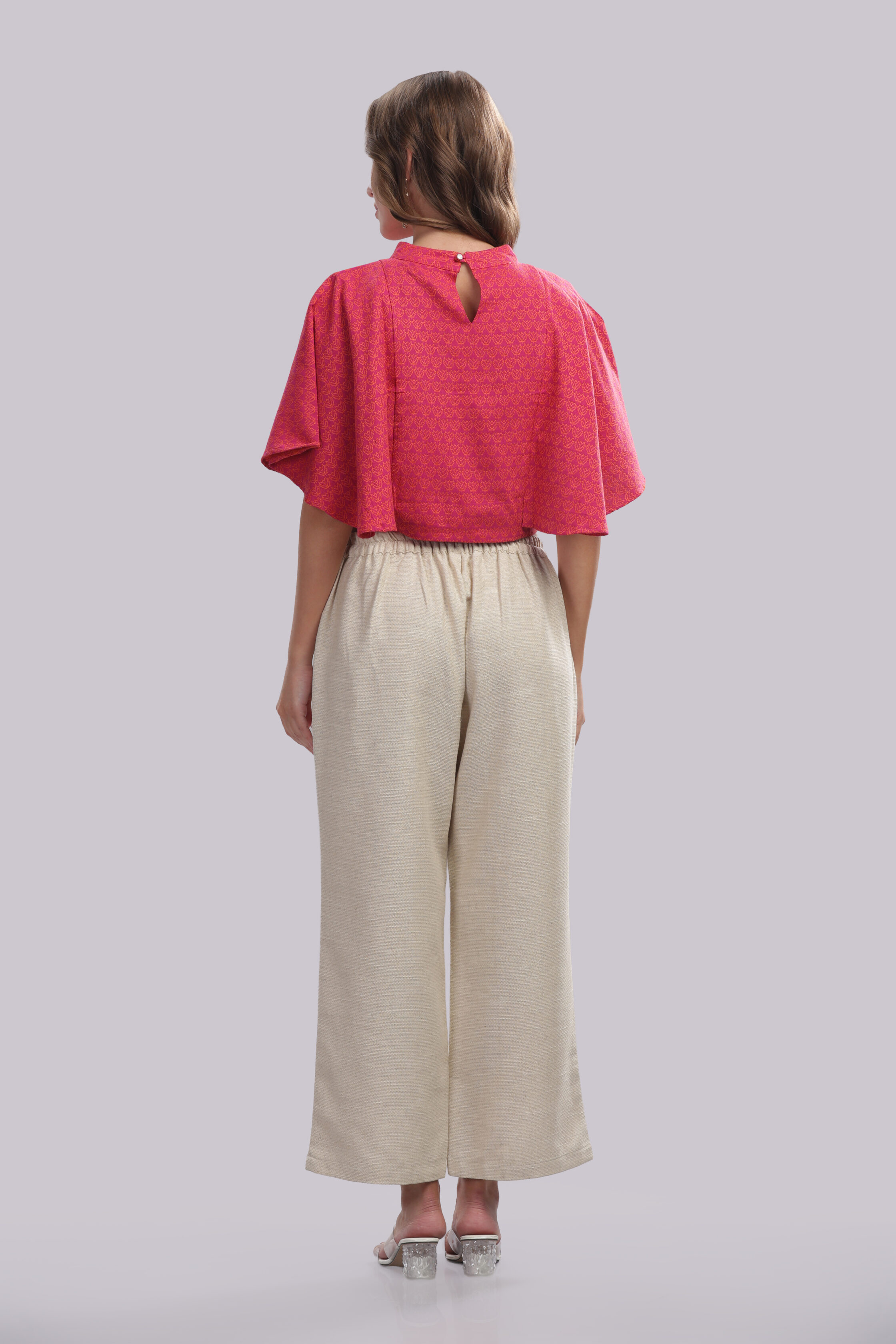 A contemporary co-ord ensemble designed for effortless sophistication, featuring a statement cropped top paired with relaxed, wide-leg trousers. The top showcases a refined all-over pattern with a fluid silhouette, while the trousers are tailored in a complementary solid tone for balance and elegance. Thoughtfully crafted, this set offers a modern, fashion-forward look with comfortable wearability.