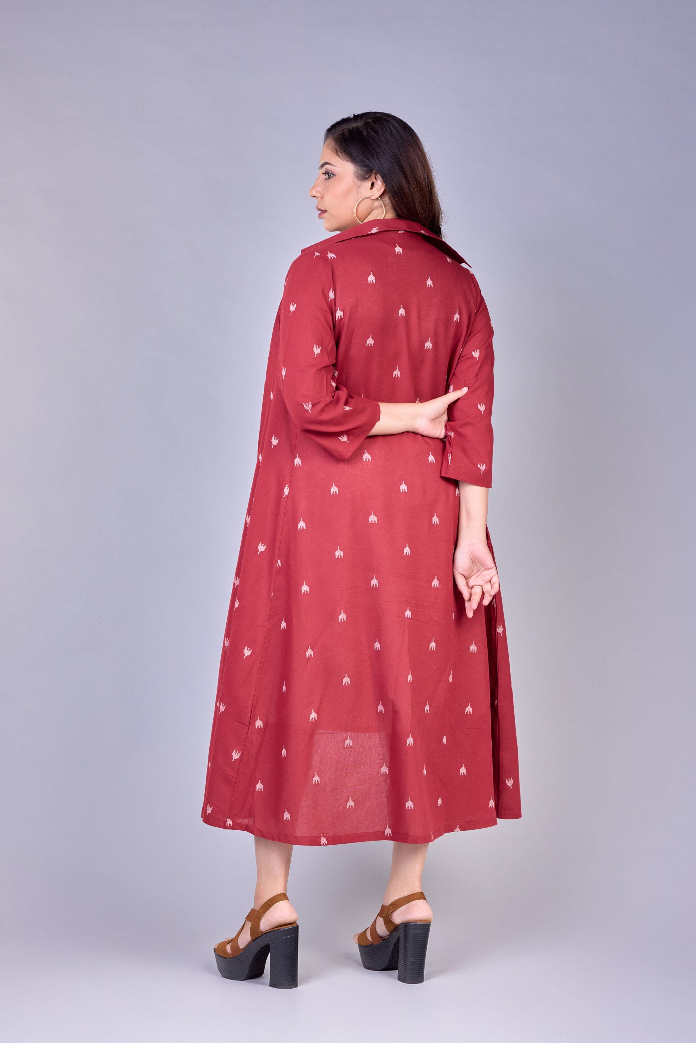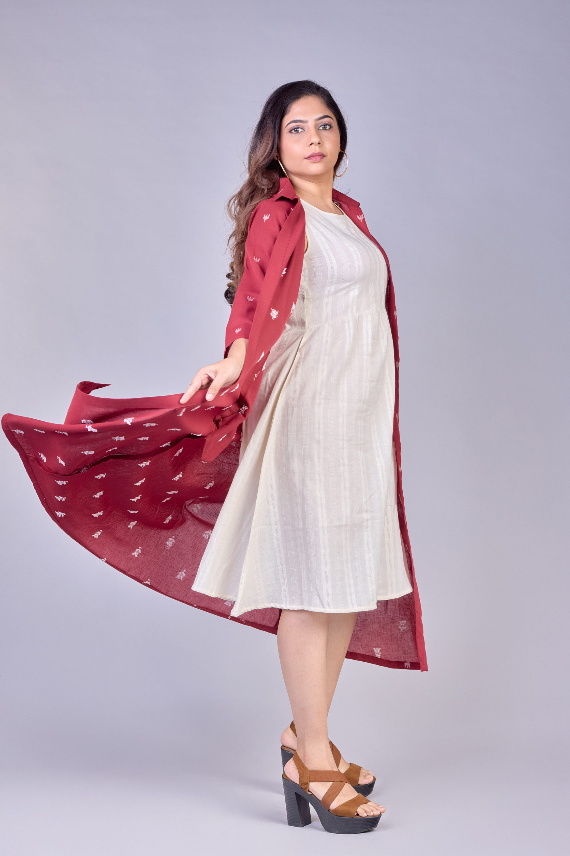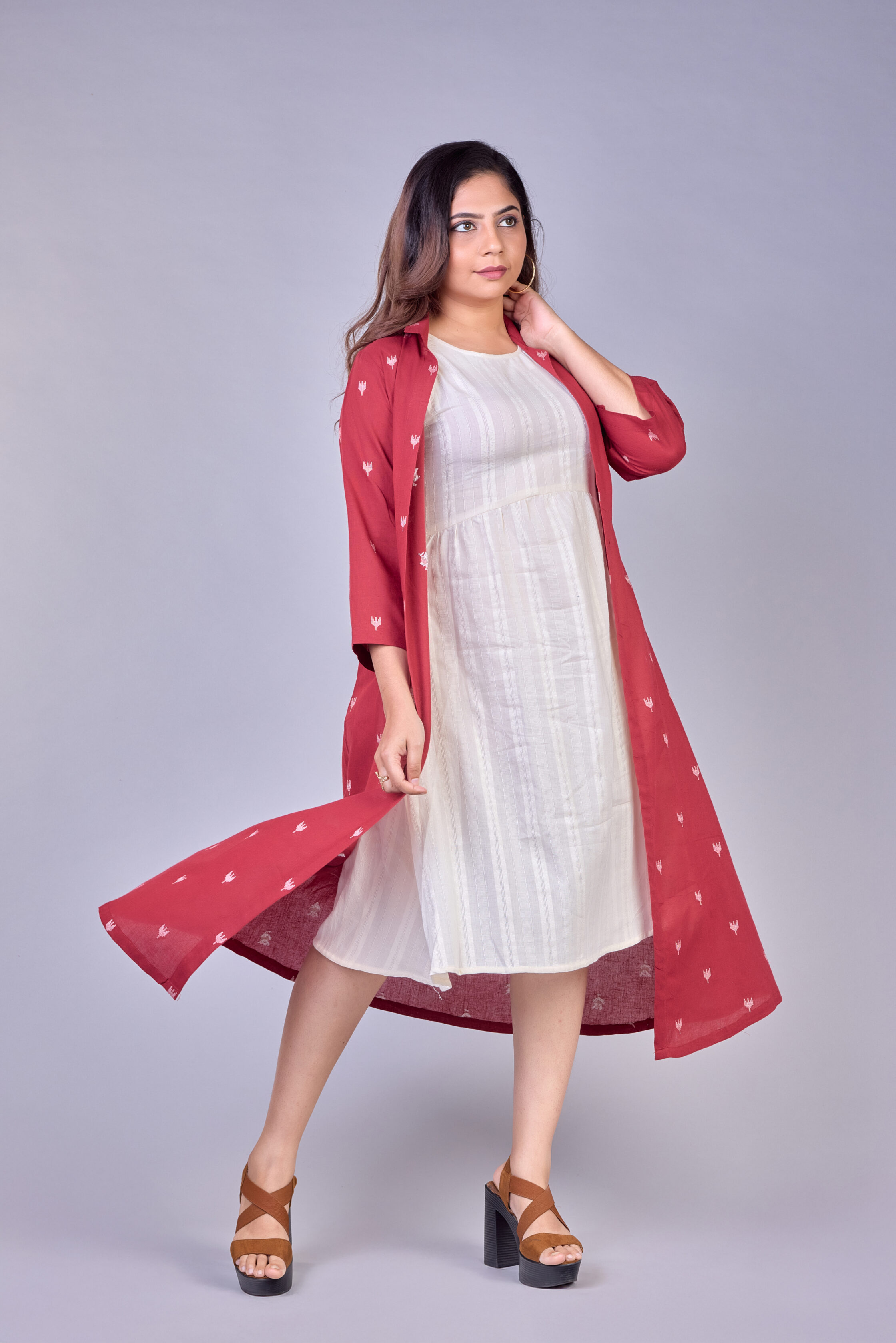 A stylish two-piece set featuring a rust printed long shrug paired with a minimal white inner dress. Perfect for everyday elegance and modern ethnic styling.