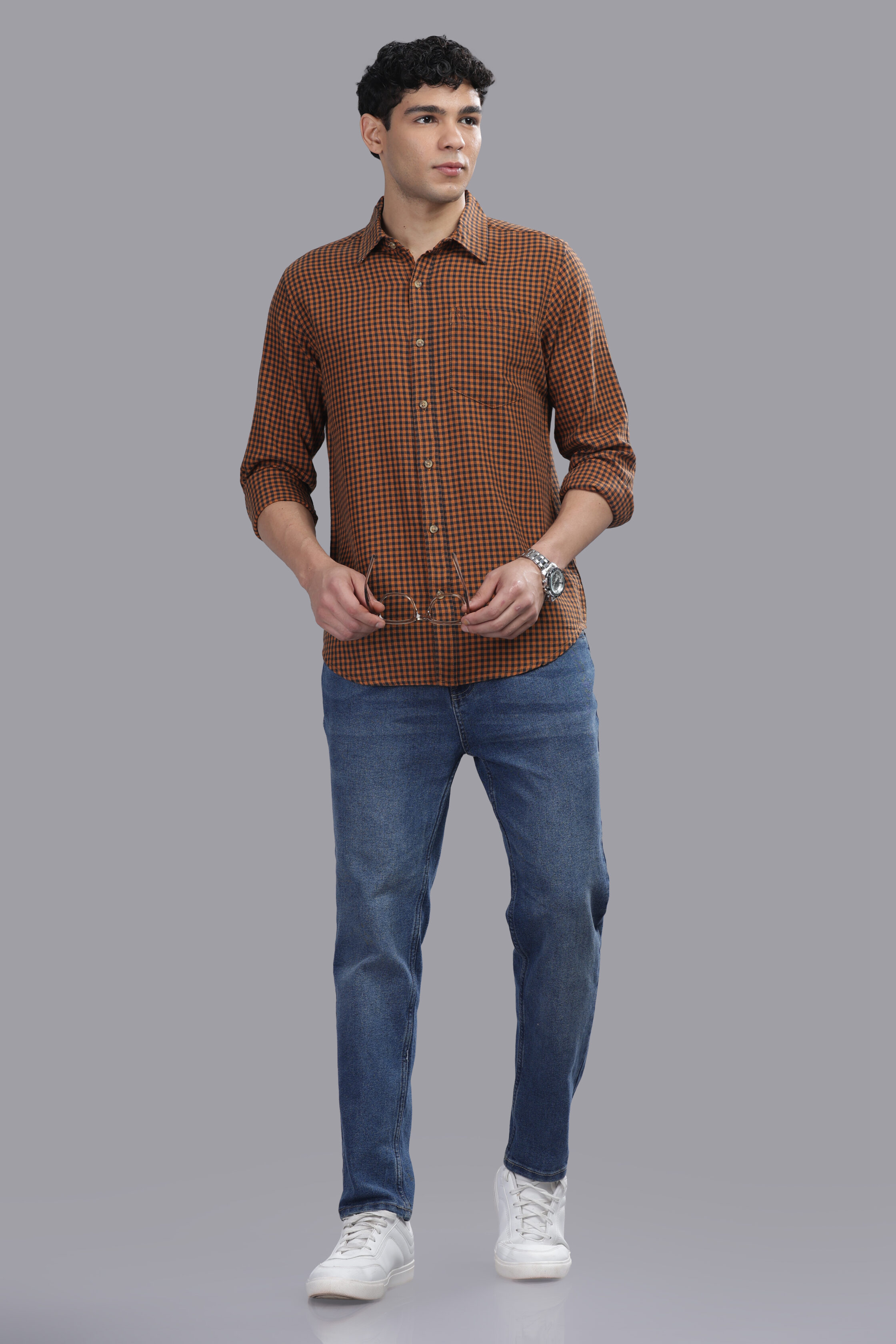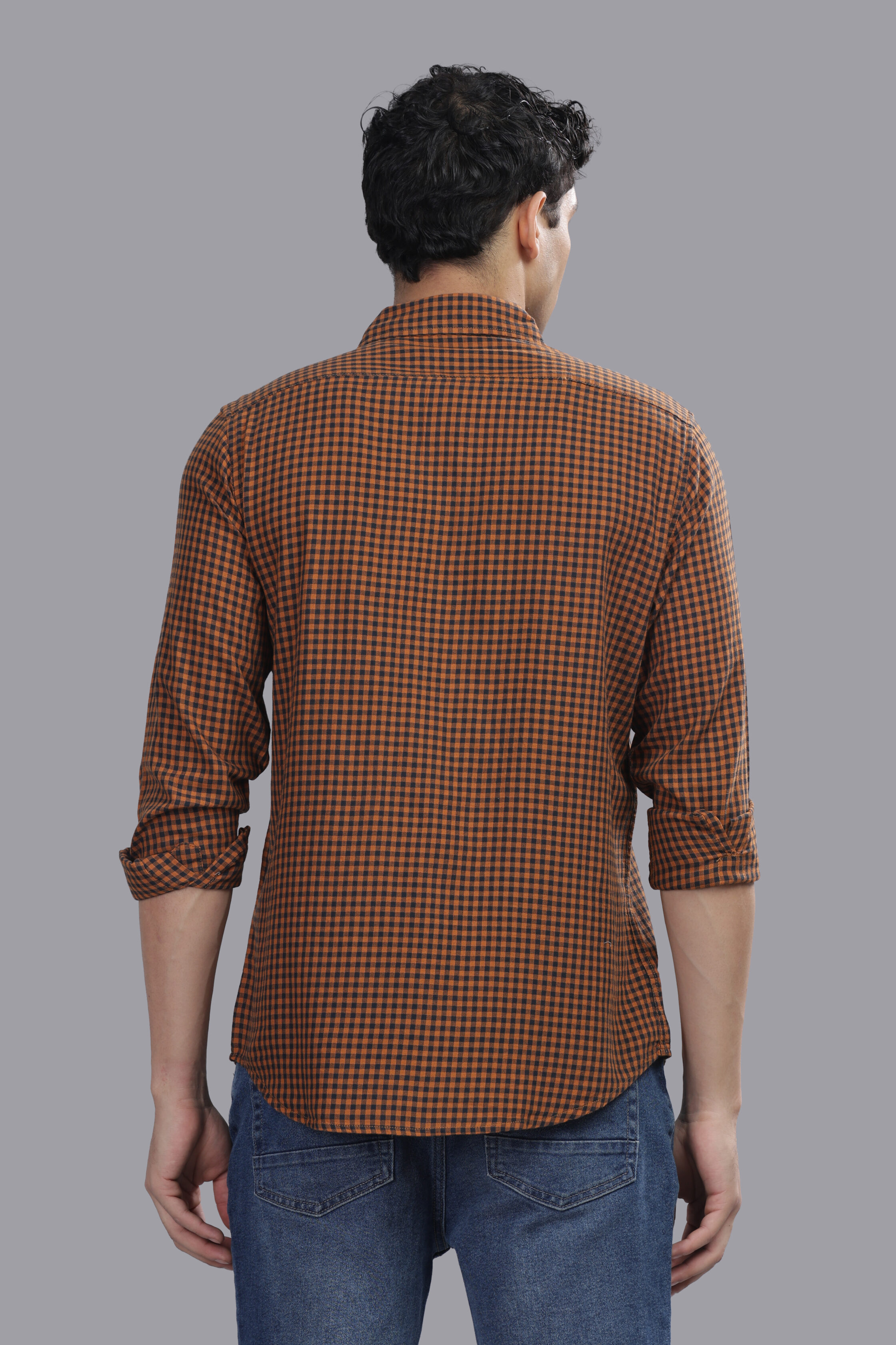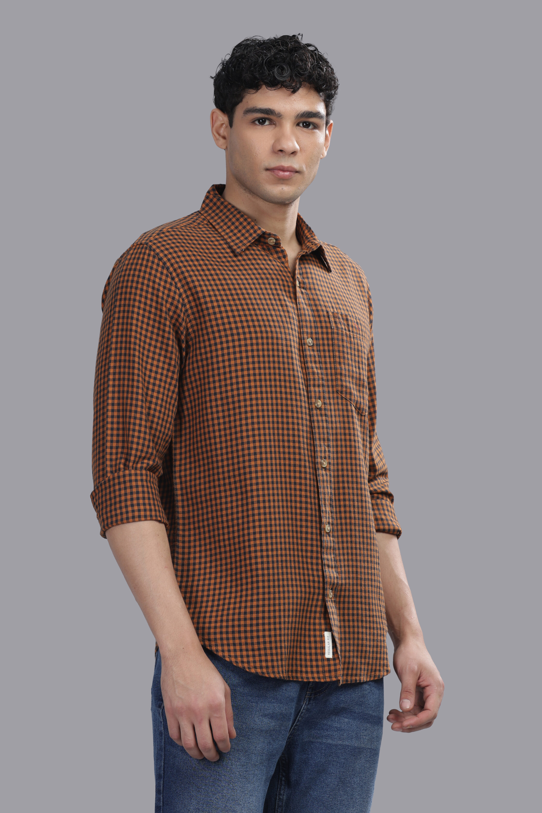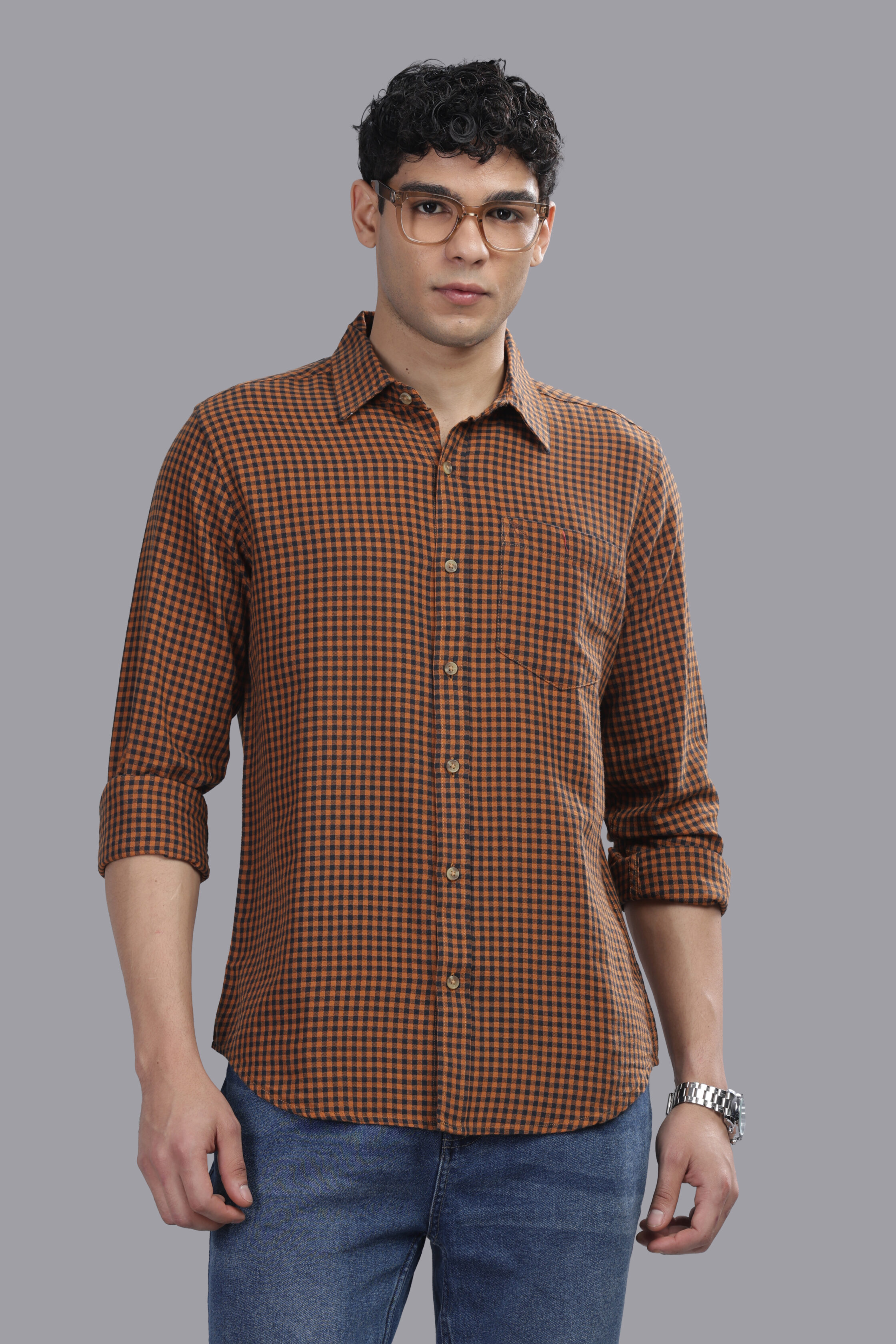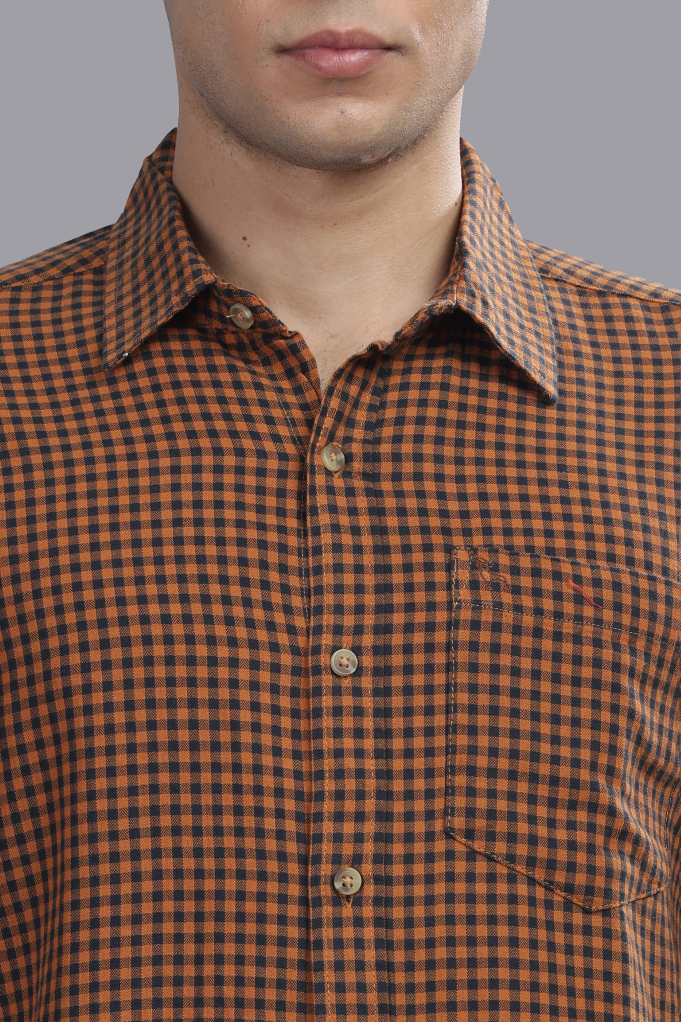 Crafted from a soft, breathable woven fabric, it features a classic micro-check pattern in warm earthy tones that delivers effortless style with a refined edge. Designed with a regular fit, this shirt offers all-day comfort while maintaining a sharp, structured look.